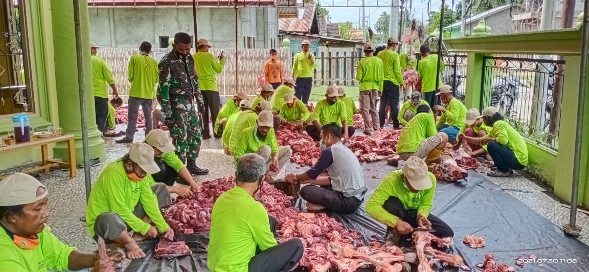 TEBO, Berandajambi – Serka Erwan Sapriandi Babinsa Kelurahan Tebing Tinggi Koramil 416-05/MT berikan masker gratis kepada semua panitia dan warga di Hari Raya Idhul Adha 1442 H diwilayah Sekubu Sumber Sari, Kelurahan Tebing Tinggi, Kecamatan Tebo Tengah, Kabupaten Tebo. Selasa (20/07/2021).