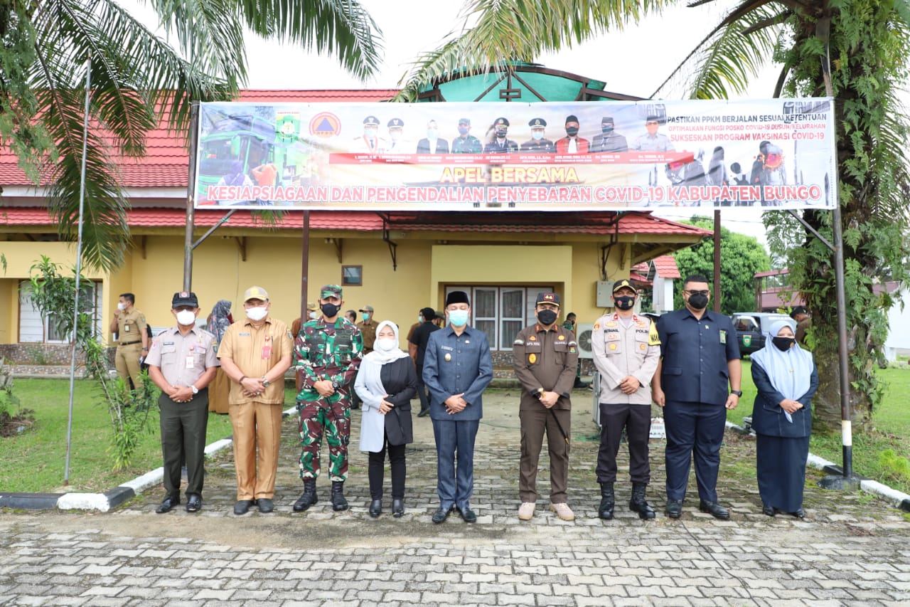 BUNGO, Berandajambi – Pemerintah Kabupaten Bungo bersama unsur Forkopimda menggelar apel serta rapat bersama kesiapsiagaan dan pengendalian penanganan penyebaran covid-19. Senin (05/07/2021).