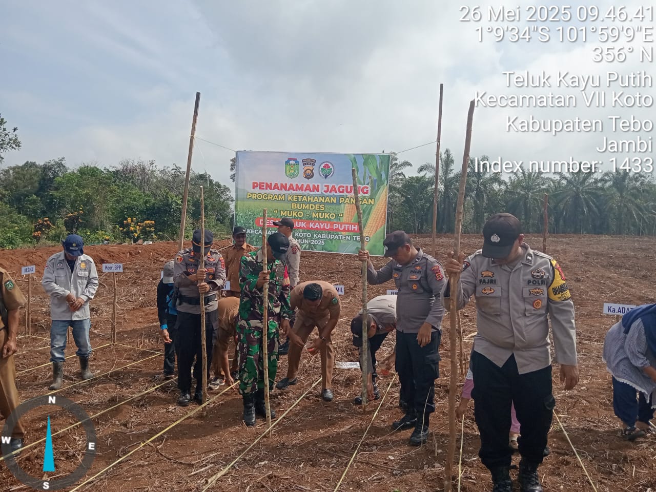 TEBO, Berandajambi – Dalam rangka mendukung program ketahanan pangan nasional dan program makan gratis, Polsek VII Koto bersama unsur Muspika dan masyarakat melaksanakan kegiatan penanaman jagung di lahan milik BUMDes Muko-Muko, Desa Teluk Kayu Putih, Kecamatan VII Koto, Kabupaten Tebo, Senin (26/05/2025).